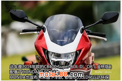 核心提示: CB400 SB版即CB400 SUPER BOL D'OR 在國(guó)內(nèi)很多摩友也叫他CB400金杯版, 至于為何叫金杯版,主要是為了紀(jì)念法國(guó)著名耐力摩