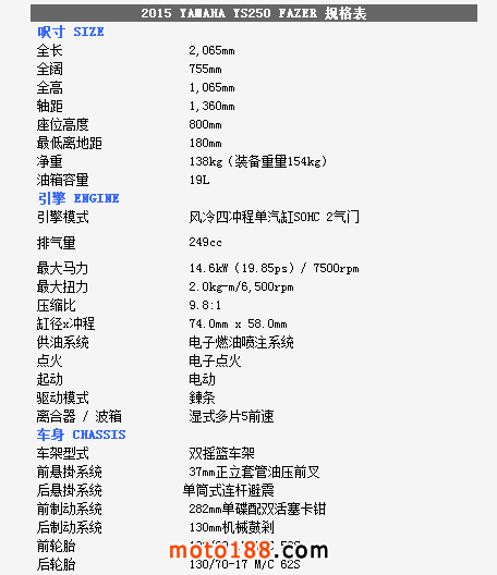 使用單汽缸引擎的YS250在成熟市場定位是入門街車,但在發(fā)展中國家卻是高級型號車 輛。YS250最具FAZER的神髓是沿用循牌型車頭大燈,車尾卻像同廠R15的跑車式尾燈設(shè)計(jì),但有點(diǎn)意外是配備了19升容積的油缸,容量媲美長途旅行 車,儲油量比MT-09及MT-07還要多,有利用作工商車之用。YS250配備的是風(fēng)冷單缸單凸輪軸2汽門引擎,排氣量是249cc,根據(jù)官方網(wǎng)站其馬 力輸出是14.6kW(19.85ps)/7500rpm,使用電子燃油噴注供油及5前速波箱。其余裝備包括37mm正立套筒前叉,但單筒尾避震卻使用較 佳吸震性能的搖臂式設(shè)計(jì),而掣動(dòng)則是前采用282mm單碟配雙活塞煞車卡鉗,尾是鼓煞設(shè)備。
