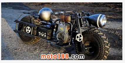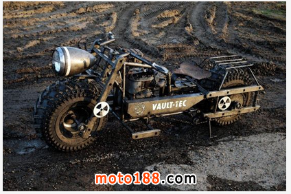 該款車由電腦游戲 Fallout 3 演變而來,號(hào)稱世界末日之戰(zhàn)車!一位名叫 Chris Riffel 的高中生某天突發(fā)奇想,從上述游戲中獲得靈感,在其朋友和老師們的協(xié)助下最終完成了 Fallout 3 現(xiàn)實(shí)版的摩托車的設(shè)計(jì)和制造。制造和組裝過程完全 DIY,自己動(dòng)手切割和焊接鋼架,發(fā)動(dòng)機(jī)則由報(bào)廢件改造而成。