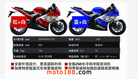 白色、紅色、藍(lán)色三種可選顏色,全新顏色外觀更具國(guó)際時(shí)尚、運(yùn)動(dòng)元素,這看上去非常性感。男人不一定會(huì)承認(rèn),但是他們喜歡騎摩托時(shí)得到的關(guān)注。大多數(shù)女人也發(fā)覺這很惹火。套組的顏色搭配非常奪人眼球,看上去充滿了陽剛之氣。