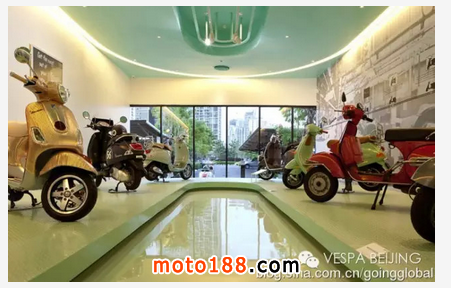 Vespa 踏板摩托已經(jīng)從一個(gè)機(jī)車品牌上升到了一個(gè)文化符號(hào),在都市創(chuàng)意群體的心目中占據(jù)著一個(gè)特殊的位置。為了迎合這種全球化的消費(fèi)文化訴求,Vespa在零售領(lǐng) 域積極擴(kuò)張,比如曼谷這家“Vespa 走廊”品牌店以及未來(lái)的許多專賣店。這家店由名為“超級(jí)機(jī)器”的機(jī)構(gòu)所設(shè)計(jì)與運(yùn)營(yíng),整家店內(nèi)標(biāo)志性的Vespa元素?zé)o處不在,從大量的迷你玩具模型展示到 主題墻上那些經(jīng)典的廣告海報(bào)。這基本上就是一場(chǎng)關(guān)于Vespa的慶典,強(qiáng)大的時(shí)尚潮流足以把一個(gè)新人車手帶入品牌文化的社區(qū)徜徉。