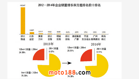 從各排量區(qū)間的銷售占比來看,250排量以上的摩托車,2014年銷量占比為0.11,同比2013年上漲0.04%.