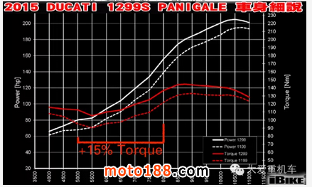 先說說引擎,Engine由1198cc撥大到1285cc,個piston bore比1199大了4mm到116mm,壓縮比是12.6:1,而這幅引擎要用上全新設(shè)計的活塞,Liner,新曲軸,新連桿。結(jié)果1299得出的馬 力是205匹,大1199差不多10匹,杻力145Nm,也比1199大10多Nm。
