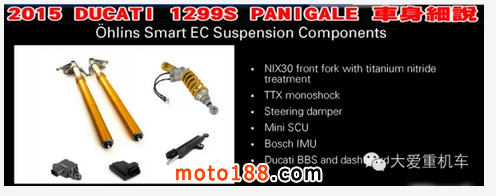 我試的是s版,有全新的電子避震,當(dāng)然是Ohlins的NIX30和TTX,steering damper是Sachs,也是電子控制的,分了兩種模式,1是fixed,和以前1199s一樣續(xù)格在表板調(diào)damping,而第二種是比較先進(jìn)的 event based的,set了這個后,ecu會按道路情況例如彎道或直路,去調(diào)整油壓,駕駛者只需按自己的喜好來調(diào)soft,harder 或hardest如此類推。