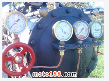 荷蘭Revatu Customs車輛改造工作室推出了一輛摩托與蒸汽火車頭混合版蒸汽摩托車,其炫酷夸張的造型讓蒸汽迷愛不釋手,各種壓力閥門、機(jī)軸驅(qū)動(dòng)的后輪,騎上去異常拉風(fēng)!其速度必然同蒸汽火車一樣不忍直視咯,每小時(shí)僅能跑5英里。