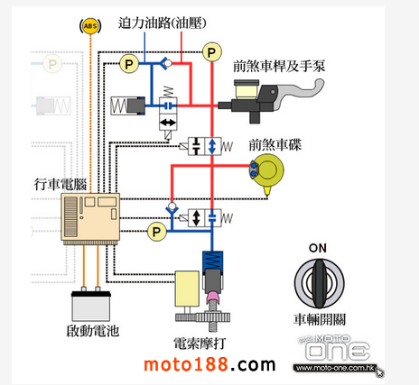 ●(為 了更簡單地說明,因此只顯示前制動)基於啟動引擎后必須達到6km/h及輕輕扣下迫力桿,C-ABS才開始運作,否則車輛只使用傳統(tǒng)迫力油壓控制前煞車碟 (紅線)。當車速超過6km/h,電腦接收訊息后,便會開啟電索摩打及活門,讓迫力油通過所有油路(包括虛線),并由電腦根據所有數據分配合適制動力。