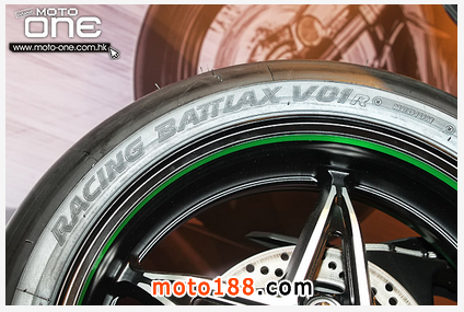 配備了最新款落場用的BRIDGESTONE V01光頭胎,前后輪框是跑車慣用的17吋輪框,車輛配備循跡系統(tǒng)等裝備,還有車輛配備跟ZX-10R相同的電子釘把,前避震是新款擁有全調校的KYB前叉,調校位置全設于叉頂上。掣動系統(tǒng)是頂級的BREMBO M50煞車卡鉗。