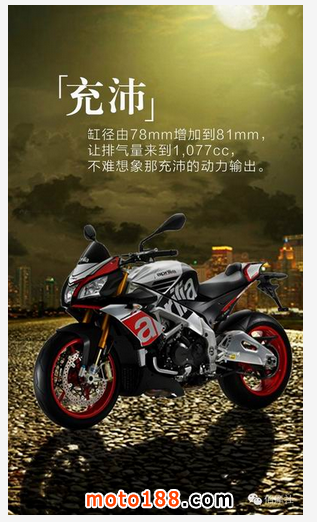 TUONO V4 1100將原本的RSV4引擎進(jìn)行修改,缸徑由78mm增加到81mm,讓排氣量來(lái)到1,077cc,讓人不難想像V4 1100那全轉(zhuǎn)速域充沛的動(dòng)力輸出。