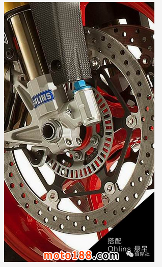 Ohlins前后避震,再外加一組Ohlins防甩頭。 V4 1100 Factory使用BREMBO M432輻射對(duì)四搭配320mm大碟。