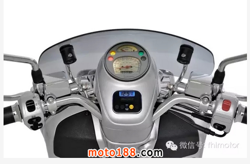 既然大燈下移,車頭部分自然清爽了許多。鍍鉻行李架,無(wú)燈設(shè)計(jì)車把加上擋風(fēng)板,美觀、實(shí)用且對(duì)味!而儀表和車把更加有特點(diǎn),有點(diǎn)類似于LXV車型,方向柱蓋采用機(jī)械圓形儀表,油量顯示和時(shí)速表完全分開,下方還有單獨(dú)時(shí)間顯示和功能提示燈,讓人一目了然。車把采用裸露設(shè)計(jì),燈光控制鍵居左,啟動(dòng)功能鍵居右。