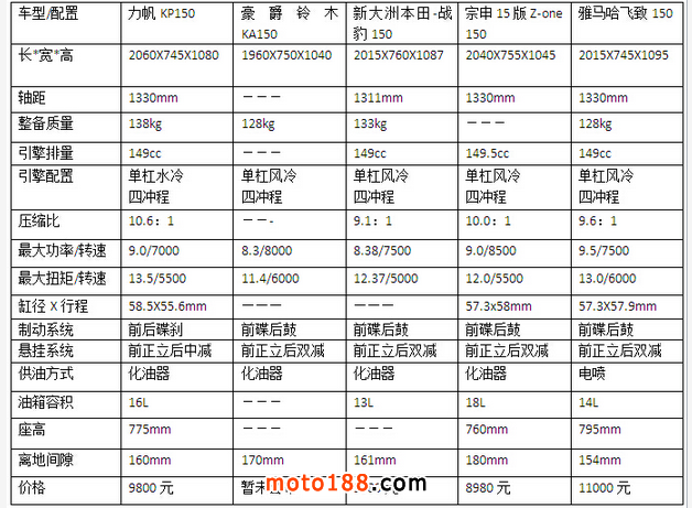 同KP150一樣,宗申Z-one經(jīng)過幾個版本的不斷改進(jìn)和創(chuàng)新,車子的整體技術(shù)已經(jīng)趨于成熟,外觀更加時尚,配置也在提升,用戶的反應(yīng)也比較好。15版Z-one150采用了全新升級的第四代PY發(fā)動機,在動力、節(jié)能、舒適性方面都有大的提升,150cc排量,功率可達(dá)9KW,最大扭矩12Nm,USB接口、高清數(shù)碼儀表盤、LED日行燈、鋁合金支架等,配置不凡。而18L的超大油箱讓同級車系望塵莫及,續(xù)航能力俱佳。五輛車中,它的性價比具有一定優(yōu)勢,相信會有不凡的市場表現(xiàn)。
