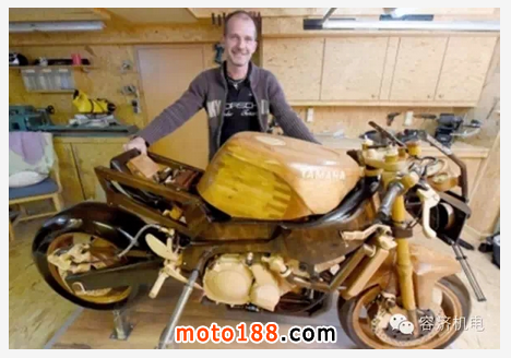 施洛瑟現(xiàn)年46歲,家住石勒蘇益格-荷爾斯泰因州尼勃施特爾村,他一直夢想買一輛雅馬哈fzr600r型摩托,妻子卻不同意。為了不惹妻子生氣,施洛瑟12年前提出造一輛木摩托放在客廳,得到妻子“恩準(zhǔn)”。施洛瑟隨后在車庫開始動工,按照原車尺寸一比一打造,這個過程讓他著迷。他說,最難的部分當(dāng)屬鏈條,包括430個零件。“有時我站在深及腳踝的木屑中……有些部件要做兩三次才能做好。”施洛瑟用壞10臺角磨機,耗費4000多個工時,終于完成這件作品,看來賢內(nèi)助還是很給力的哈。