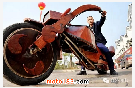 別以為木制摩托車是國外人的專利,國內(nèi)一樣有不服輸?shù)奶魬?zhàn)者,甚至造車比國外水準(zhǔn)更高的木制摩托車。只有初中文化的江西省廣豐縣銅鈸山農(nóng)民藝人余接濤,是當(dāng)?shù)氐囊幻L期在外打工的木雕設(shè)計和雕刻師。前不久,他利用一個多月時間,花費2萬余元自造一輛長2.7米、高1.25米、寬0.9米“炫風(fēng)牌”木制摩托車首次亮相,該車除了輪胎、發(fā)動機等關(guān)鍵部位外,外觀全由緬甸花梨木加工制造。