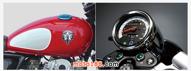 核心提示:◆水滴形油箱烤漆采用汽車級(jí)珠光材料,高純度色彩配以水滴造型的偏口油箱設(shè)計(jì),更顯復(fù)古時(shí)尚。 ◆歐式單只簡約里程表古簡風(fēng)格的