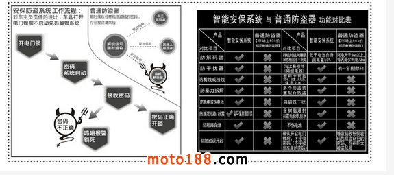 采用電子解鎖的方式,達到控制車輛的警報以及點火裝置的作用。在某些治安不是很發(fā)達的地區(qū),這樣的一個裝置,為車主提供了不少的便利,不用再花大價錢去另外安裝一個報警裝置,或者在本來平價的摩托車上,裝上一個價格昂貴的GPS定位儀。