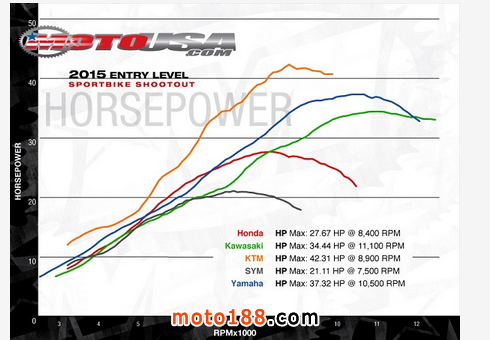 話不多說(shuō),介紹完選車標(biāo)準(zhǔn),下面上干貨。在測(cè)試之初,Motorcycle-USA就將5款車進(jìn)行了功率、扭矩和提速測(cè)試,測(cè)試結(jié)果如下。