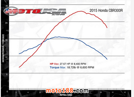 2015 本田CBR300R將目光直指川崎忍者300,較CBR250R比起來(lái)有了很大的進(jìn)步。需要說(shuō)明的是雖然稱它為CBR300R,但其真實(shí)排量只有286cc,即便如此,它卻只比296cc排量的忍者300少6.7匹馬力。而CBR300R在6600轉(zhuǎn)的時(shí)候就可達(dá)到最大功率18.72lb,相對(duì)于忍者300的最大功率17.37lb/10000轉(zhuǎn)來(lái)說(shuō),力量來(lái)的更快更直接。直到8400轉(zhuǎn)左右的時(shí)候,兩輛車的表現(xiàn)不相上下,越往后,本田開(kāi)始處于劣勢(shì)。這是單缸機(jī)的優(yōu)勢(shì)同時(shí)也是缺點(diǎn)所在。