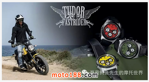 在這場(chǎng)時(shí)尚盛宴里,連杜卡迪的官方手表合作商帝舵也被拉了進(jìn)來,專為Scrambler設(shè)計(jì)了一款手表:Fastrider Chrono。帝舵2015年推出的Fastrider Chrono是專門以Scrambler為靈感所設(shè)計(jì)出的腕表。集杜卡迪和帝舵的美學(xué)之大成,這款腕表共有三款表盤可供選擇——代表Scrambler經(jīng)典色彩的亮黃色、帶有強(qiáng)烈城市色彩的橄欖綠和洋溢著復(fù)古風(fēng)情的紅色,每一種顏色都讓人想起騎士們?cè)陲L(fēng)中馳騁的樣子。多彩的表盤,功能性的手表正好可以戴在穿著復(fù)古皮衣和短款騎行手套的Scrambler騎士的手腕上。杜卡迪并不是所有車系都有專屬手表,Scrambler是杜卡迪車系中除了Diavel(大魔鬼)之外唯一一個(gè)擁有專屬手表的車型,可見杜卡迪對(duì)它的重視。
