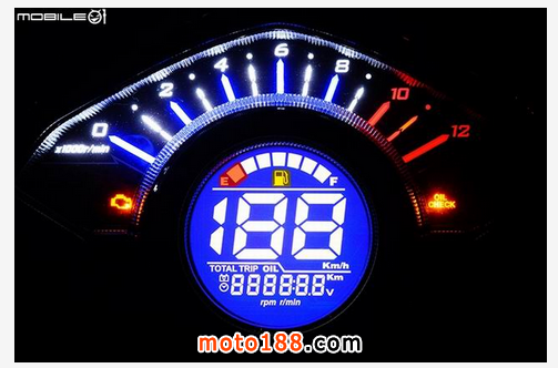 儀表板下方的多功能液晶顯示區(qū),除了基本的油量表與時(shí)速表顯示功能外,最底下的部分可以在總里程、單趟里程、機(jī)油使用里程、時(shí)間顯示、電壓表與數(shù)字式轉(zhuǎn)速表進(jìn)行切換,其中最后的數(shù)字式轉(zhuǎn)速表的單位為百位劃分,也就是盡會(huì)顯示百位數(shù)以上差異,如 1100rpm 1200rpm 1300rpm,并無(wú)法顯示至 1150rpm 1200rpm 1250rpm 這種較細(xì)的劃分方式。
