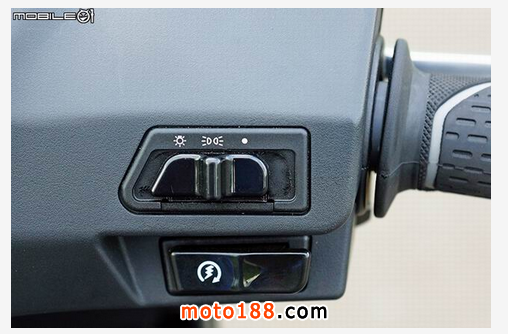 左把手的開(kāi)關(guān)部分,從上到下分別是遠(yuǎn)燈/近燈/超車(chē)燈開(kāi)關(guān)、方向燈開(kāi)關(guān)與喇叭按鈕,超車(chē)燈采用小型速可達(dá)的設(shè)置方式,騎乘時(shí)若要使用超車(chē)燈比較不方便一些。