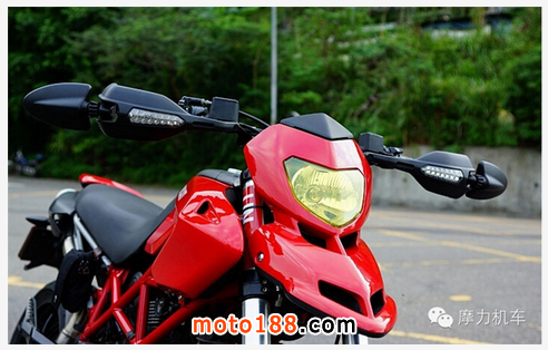 車頭,Hypermotard 796的大土除采用與車身相同顏色烤漆,搭配把手尾端的收折式后照鏡,以及越野車常見的謢弓,并在護(hù)工前端安裝方向燈,讓車頭的線條簡單又特殊。