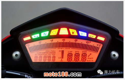 而儀表板的功能,則超乎我所想的多,上方指示燈部分從左到右分別是超轉(zhuǎn)燈1、方向燈、空轉(zhuǎn)燈、引擎故障燈、超轉(zhuǎn)燈2、油量不足警示燈、遠(yuǎn)燈指示燈、機(jī)油油壓不足警示燈、超轉(zhuǎn)燈3,左下角則有單趟里程、總里程、油量不足正數(shù)里程、時鐘、保養(yǎng)提醒里程、電壓偵測、數(shù)字顯示引擎轉(zhuǎn)速表、計(jì)時用顯示區(qū);右下角則除了時速表以外,另可對應(yīng)左下的模式顯示目前功能,如要顯示電瓶電壓時,左下角的區(qū)域會顯示電瓶電壓值,或者顯示LOv/HIv,右下角的區(qū)域則顯示"BAT"字樣,代表目前儀表板所顯示的數(shù)值為 BATTERY (電瓶),這些功能可在說明書中了解甚多,并且可以注意到左下角的顯示區(qū)中,有一個 DDA 的功能,這功能可以獨(dú)立出來說明。