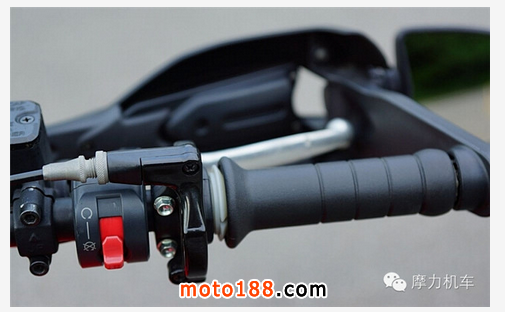 右把手部分,油門座采用大型重型較少見的單油門線,而把手開關(guān)部分,則有引擎熄火/啟動與電發(fā)按鈕,引擎電發(fā)按鈕在熄火開關(guān)撥到關(guān)引擎的情況時,會一起被遮蔽下來,以避免誤觸造成空轉(zhuǎn)的情況發(fā)生。