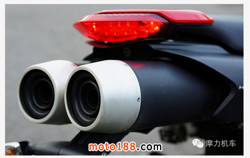 車尾,Hypermotard 796 具有雙出排氣管,采用二合一出二的設(shè)計(jì),在底部設(shè)有觸媒,消音塞等則在尾管之中,而車尾的線條也再簡單不過。
