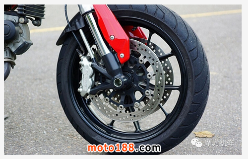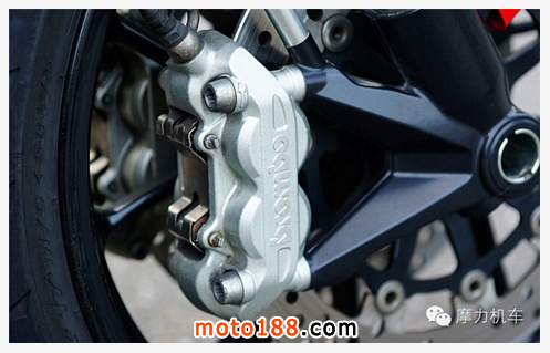 而卡鉗則位于碟盤底下,采用 Brembo 對向二活塞卡鉗,型號為 P34c,而因?yàn)檫@臺車沒有 ABS 配備,因此在煞車時要注意后輪的緊度,尤其偏大的碟盤加上如此有力的剎車系統(tǒng),更得要注意低路面磨擦力的剎車拿捏。