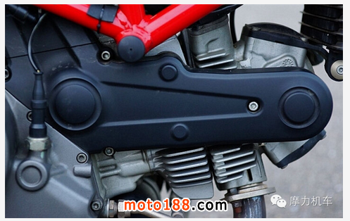 DUCATI 獨(dú)家的 Desmodromic 氣門技術(shù),氣門的開啟或關(guān)閉都僅靠凸輪軸推動,并在 Hypermotard 796 以及其他大多數(shù) DUCATI 車款舍棄內(nèi)鏈,改以正時皮帶拉動氣門凸輪軸,另外在 Hypermotard 796 上僅有單凸輪軸設(shè)計(jì),因此缸頭體積,以及引擎重量都可獲得輕量的效果,圖中的黑色蓋子,就是驅(qū)動 Desmodromic 凸輪的外置式皮帶護(hù)蓋,內(nèi)部采用與汽車相同的正時皮帶設(shè)計(jì),相信設(shè)計(jì)師絕對有他的理由。