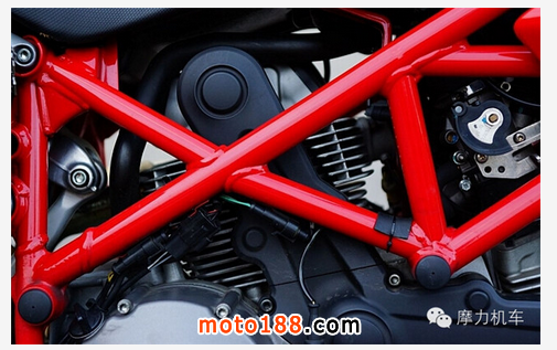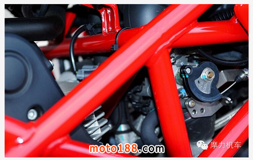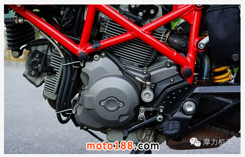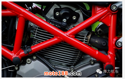 接著看到被稱為 L 型雙缸的 V型90度雙缸引擎,這顆由 DUCATI 制作的雙缸引擎,在 8000rpm 時能爆發(fā)出 81hp 的馬力數(shù)值,而在 6250rpm 時則能提供 7.7kg-M 的扭力輸出,對于這樣輕量化的車體而言,帶來的樂趣已經(jīng)非常多。