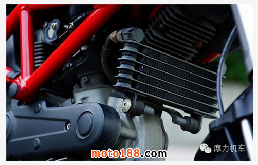 而位于引擎前方撞風(fēng)面,是機(jī)油的冷卻冷排,雖然這顆引擎為空冷引擎,但是機(jī)油溫度也需要適當(dāng)?shù)睦鋮s,避免機(jī)油因?yàn)橐娓邷囟呀猓斐沙詸C(jī)油等情況發(fā)生,另外儀表板中央的溫度表部份,顯示的也是機(jī)油溫度,而不是引擎溫度,可見在空冷引擎下,機(jī)油也是一個重要的散熱媒介。