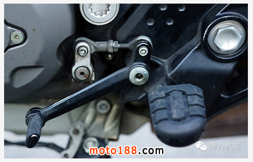 位于引擎右側(cè)的后煞車及腳踏,支架固定方法非常直接,與固定后搖臂的搖臂軸心采用同一支螺桿,這樣少了多余的螺絲與螺帽,對線條上以及維護(hù)上都來得簡易許多。