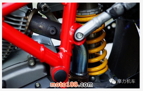 后缸的排氣管頭段,則包在車臺內(nèi)側(cè),與避震器的距離算蠻貼近的。