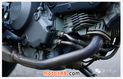 因?yàn)槭荲型90度雙缸引擎,因此排氣管為一缸獨(dú)立一支,這邊則是前缸的排氣管頭段。