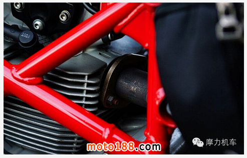 另外從這個角度,可以很明顯看到有著 Desmodromic 氣門的缸頭,因內(nèi)鏈沒有內(nèi)建在缸體內(nèi)的緣故,所以整個缸頭的大小比普通四行程單凸輪軸引擎小很多。