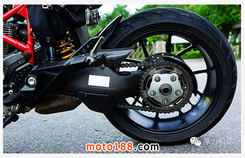 Hypermotard 796 搭配的803c.c. V型90度氣冷 Desmodromic 引擎,能夠提供 81hp的馬力輸出,相信對于普通道路而言是非常實(shí)用的,輕量化的車身,加上單搖臂的設(shè)計(jì),以及由 Marzocchi 所生產(chǎn)的 43mm 前叉 / Sachs 所生產(chǎn)的后避震,對于彎中穩(wěn)定性以及吸震性都能提高,整車輕量化的關(guān)鍵,其中來自由 enkei 生產(chǎn)的輪組占了不少功,輕量化的輪組對于輪心陀螺儀效應(yīng)能夠減低,讓車輛的靈活度提升,在彎中的指向性能夠更為明確快速,這樣均衡的配置,騎乘 Hypermotard 796 的樂趣會更為有趣。
