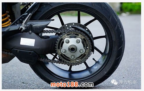 輪座采用鋁合金材質(zhì),齒盤為41齒數(shù),鏈條原廠搭配則是由 DID 所制作的油封鏈條,規(guī)格為 525HV2,共104節(jié)。