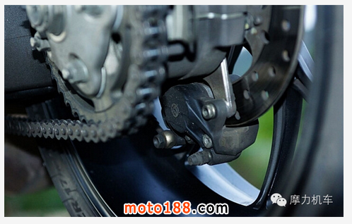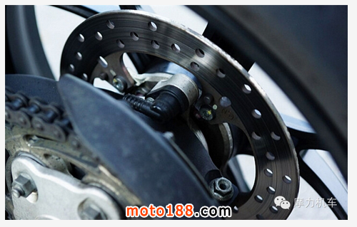 后碟盤則位于齒盤后方,為 245mm的固定碟盤,時速表的速度感應(yīng)器也位于此處;而原廠對時速表的部份,也直接在原廠車主手冊說明,在儀表板上看到的時速為 +8% 于真實(shí)時速,也就是若真實(shí)騎到時速100KM/h,儀表板會顯示 108KM/h。