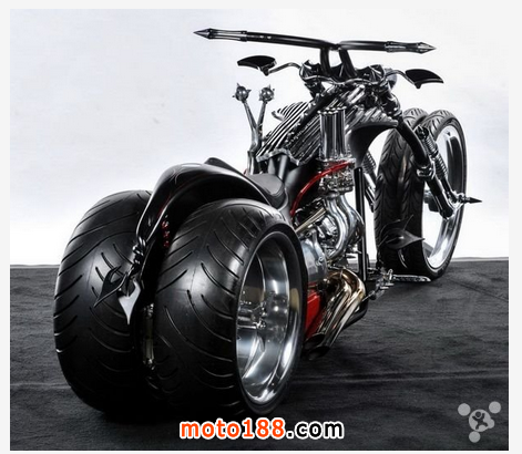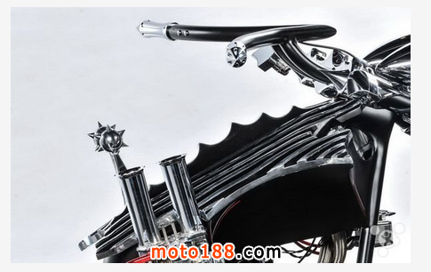Twisted Evil摩托車采用的是霸氣的四輪設(shè)計,碩大的雙后輪給人一種十分強悍的感覺。車身整體采用的是黑銀相間的配色,大量銳利的裝飾顯得侵略性十足。從這點來說,Twisted Evil確實蠻邪惡的。