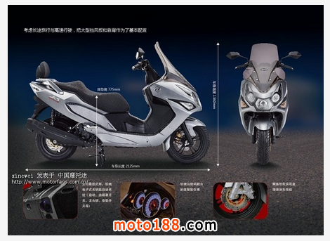 碟影QM250T由輕騎自主研發(fā),搭載一顆250cc電噴水冷單缸發(fā)動機(jī),主要針對歐洲、南美、日本市場推出的一款250運(yùn)動踏板車型,該車在國內(nèi)以很火熱。飽滿的前臉、動感的腰線、大氣的鞍座、時(shí)尚的深灰色直觀的不表現(xiàn)出了它濃郁的歐式設(shè)計(jì)風(fēng)格,集運(yùn)動、休閑于一體。加粗避震避配合前后120/70-15,140/70-14大尺寸鋁合金輪廓有著不錯的通過性。
