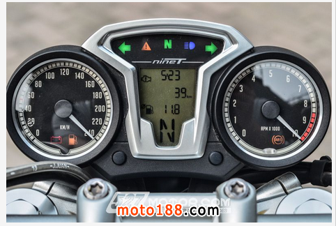 圖說:圓形轉(zhuǎn)速表和速度表,構(gòu)成古典的雙圓盤結(jié)構(gòu),烘托精煉質(zhì)樸的韻味;信息豐富的多功能顯示屏,提醒你這是最前衛(wèi)的復古街車。