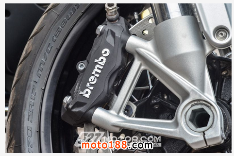 圖說:制動系統(tǒng)標配ABS,前剎車系統(tǒng)采用320mm雙浮動式碟盤、BREMBO輻射式四活塞剎車卡鉗,后剎車系統(tǒng)采用265mm碟盤雙活塞卡鉗。