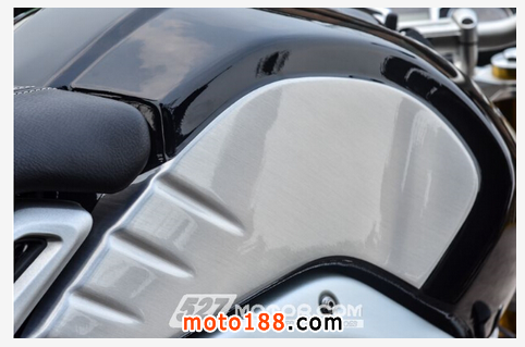 造型獨特的油箱是全車的一大亮點,該油箱采用鋁合金一體成型打造而成,而且整個漆面完全采用手工繪制,特別是腿部經(jīng)常夾持的發(fā)絲紋部分更是費盡心思。整個油箱先由德國制造成型,再將其送到意大利,由工匠將發(fā)絲漆面紋處理完成,最后再運回德國進行手繪描邊上色等工藝,整個過程全部由工匠手工完成,做工考究、質(zhì)感上乘。