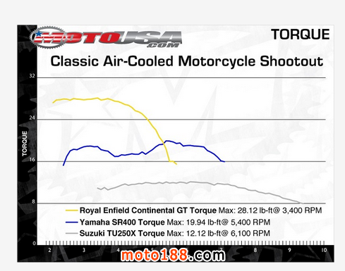 排量?jī)?yōu)勢(shì)完全體現(xiàn)在了車子的扭矩上,皇家恩菲爾德以最大扭矩38.12N.m的優(yōu)勢(shì)遙遙領(lǐng)先,比鈴木TU250X的扭矩的兩倍還多。