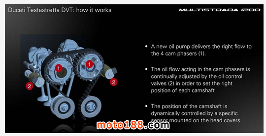 ●根據(jù)廠方介紹,新的DUCATI Desmodromic Variable Timing搖臂式可變正時(shí)控制系統(tǒng)可提升7%馬力及9%扭力,但可節(jié)省8%耗油量。