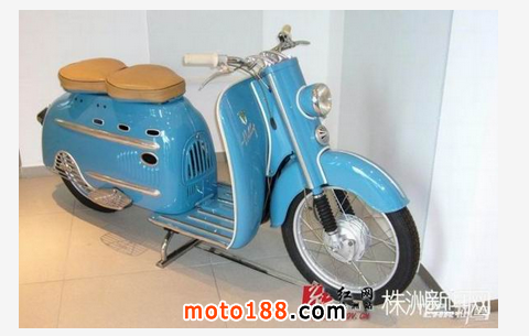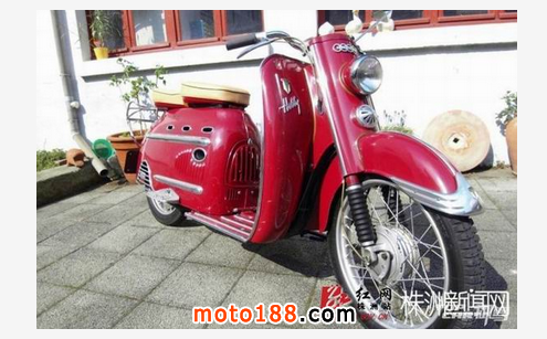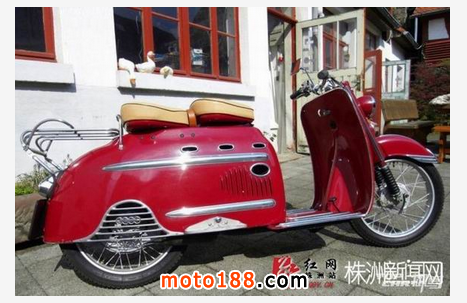 請輸入這臺紅色踏板車的全稱是DKW Hobby,1955年由德國奧迪汽車出品。此車是采用2沖程發(fā)動機的踏板摩托車,做工精致嚴謹,用料扎實,成為現在歐洲很多車迷的熱捧車型。1954-1957年間,奧迪共生產了45303臺DKW Hobby。