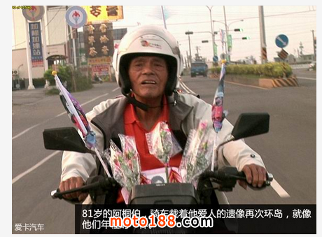 在他們之中,一位人稱阿桐伯的老者讓我格外敬佩。他此次環(huán)島的目的,是要完成對妻子的承諾。年輕的時候,阿桐伯每年都會載著妻子環(huán)島騎行。一個美麗的傍晚,妻子問他:“我們環(huán)島,你還能載我多久?” 他回答:“若80歲時我還活著,一定還會載你。”憑著這樣一句簡短的話,81歲的阿桐伯再次出發(fā),但他的妻子卻在21年前永遠的離開了。