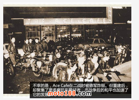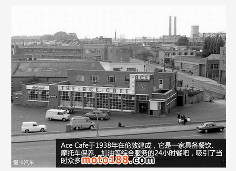 Ace Cafe于1938年建成,是一家位于倫敦近郊的餐吧,它除了具備餐飲服務外,還提供摩托車的保養(yǎng)和加油。不過,在它開幕的前一年,發(fā)生在世界另一端的“盧溝橋事變”,卻已經揭開了戰(zhàn)爭的序幕。二戰(zhàn)中,Ace Cafe被轟炸倫敦的德軍轟炸機摧毀,直到1949年時才被重建。但也是從這一刻起,Ace Cafe開啟了屬于它的傳奇故事。
