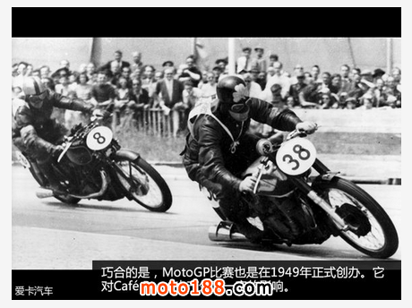 那時的Ace Cafe里,人們除了咖啡、搖滾樂和摩托車以外,還有一個共同的愛好,那就是MotoGP。巧合的是,這項賽事由于戰(zhàn)爭原因,也順延至了1949年才正式開始。Café Racer受到了GP的極大影響,連摩托車改裝風格也與當時的GP賽車相仿。
